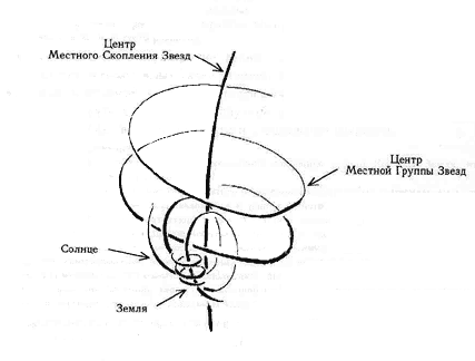 Во-первых. Определяющим источником развития планетарной жизни выступает система сложных космофизических отношений, которые возникают в ходе ритмопеременных пульсаций и взаимообращений различных тел и образований Солнечной системы, Галактики, Вселенной. В этом косморитмическом механизме наша Галактика «Млечный путь» образует гигантский «соленоид» (Рис. 1), состоящий из множества энергетических «катушек» (спирально- эллиптических траекторий различных вращающихся космических объектов), которые иерархически нанизаны одна на другую (по принципу «спираль на спирали«).