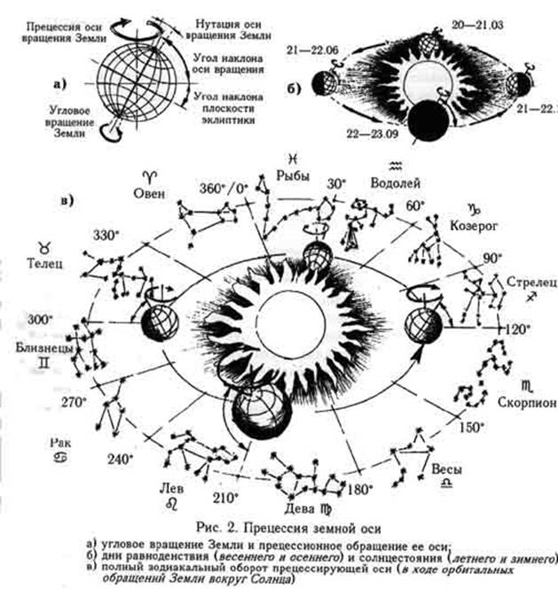 При орбитальном обращении особую роль играют дни весеннего и осеннего равноденствий — 21 марта и 23 сентября, когда оба полюса Земли равноудалены от Солнца, лучи которого падают на околоэкваториальную поверхность Земли отвесно, уравновешивая световую длительность дня и ночи. В эти моменты прецессирующая земная ось перпендикулярна лучу «Солнце-Земля». Однако из-за своего конусообразного дрейфа она каждый год попадает в эти дни {перпендикуляры к Солнцу) с некоторым систематическим запаздыванием. Согласно новейшим экспериментам и расчетам такое ежегодное весеннее запаздывание Земли составляет около 45″. Из-за него Земля попадает в свою исходную «весеннюю точку» примерно через 23 188 лет {так называемый «большой космический год»). 1/12 часть этого полного прецессионного оборота («большой космический месяц») составляет примерно 1/932 года.6 Эта градация в определенной мере условна: динамика межзодиакальных переходов и соответствующих космогеофизических нагрузок неравномерна из-за различий расстояний между зодиакальными созвездиями и комплексами влияющих сил. Вместе с тем, по прошествии «космического месяца» небесная сфера как бы сдвигается по отношению к Земле на 30° и постепенно выдвигает на небосклон то новое созвездие Зодиака, на фоне которого с Земли каждый год (в дни весеннего равноденствия наступившего двухтысячелетия) наблюдается восход Солнца. С конца 90-х — начала 2000-х годов — это созвездие Водолея.